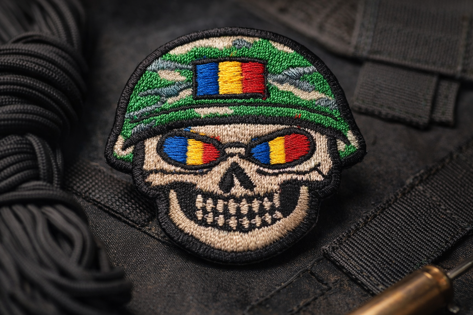 Emoji brodat de înaltă calitate, cu design skull și elemente tricolore, realizat pentru pasionații de stil military și accesorii tactice.